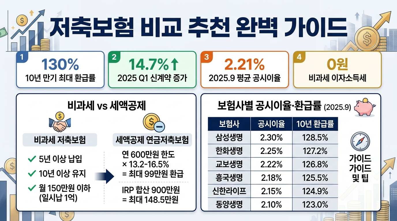 10년 만기 환급률 130%, 이자소득세 0원 비과세, 세액공제 최대 99만 원! 저축보험의 모든 것을 한눈에 비교하세요.