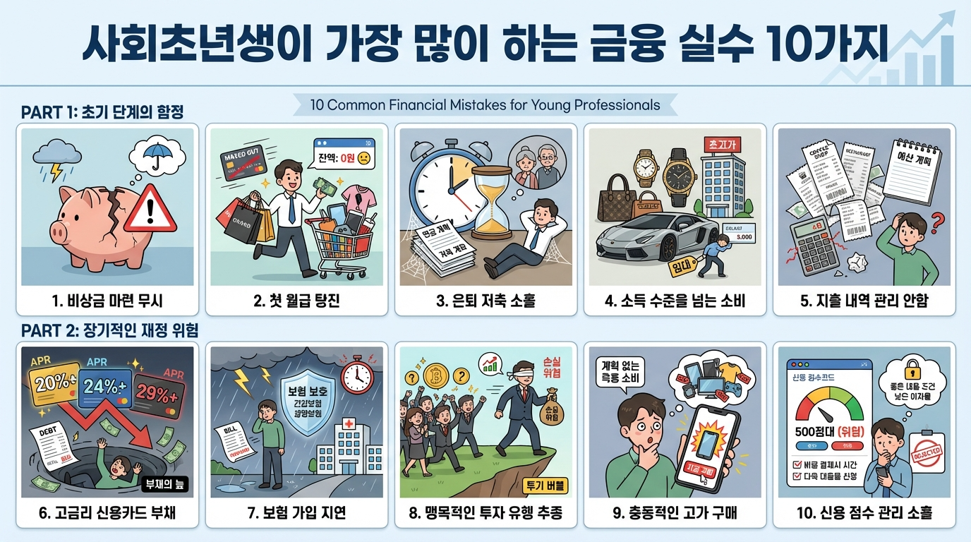 이 글에서는 시중은행 PB(프라이빗뱅커)와 금융감독원이 공통적으로 지적하는 사회초년생의 금융 실수 10가지와, 각 실수에 대한 구체적 해결 방법을 정리합니다.