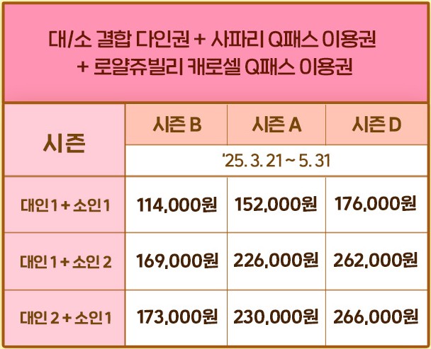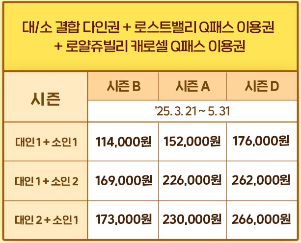 - 가족 큐패스: B시즌 기준 대인 1 + 소인 1 약 114,000원부터 시작