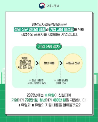 청년일자리도약장려금은 청년 고용 창출과 장기근속 유도를 목표로 청년을 정규직으로 채용한 중소기업에 인건비를 지원하는 고용노동부 주관 정책입니다.
