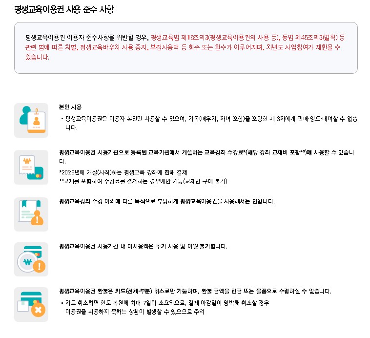 - 카드 발급: 선정된 이용자는 NH농협 체크카드 (평생교육희망카드)를 발급받아야 하며, 이는 농협 영업점 방문 또는 온라인 신청이 가능합니다.
