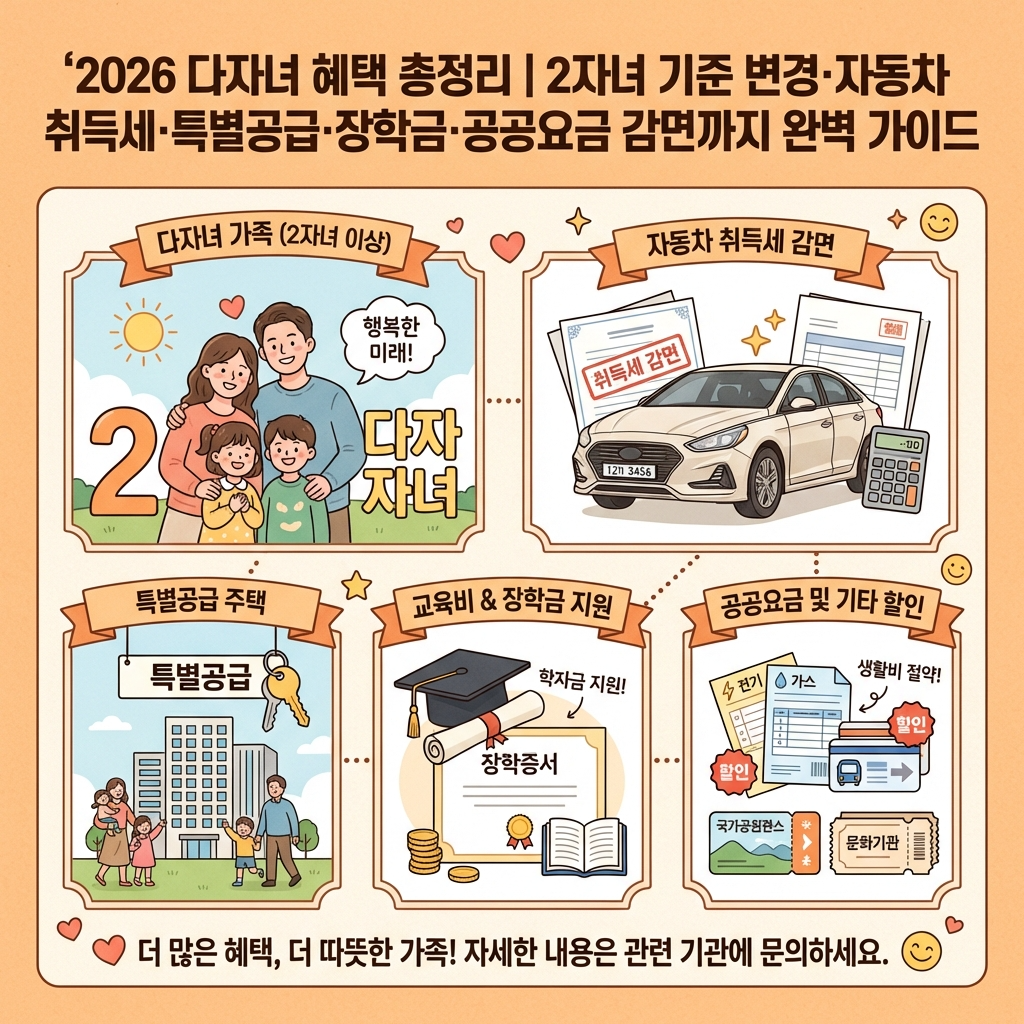 아이를 키우는 부모님이라면 "우리도 다자녀 혜택 받을 수 있을까?"라는 질문을 한 번쯤 해보셨을 겁니다. 2026년은 한국 저출산 대응 정책이 사실상 가장 공격적으로 확대된 해입니다. 가장 큰 변화의 핵심은 기존 3자녀 → 2자녀로 다자녀 기준이 거의 전면 통합되었다는 점인데요, 자동차를 살 때, 집을 구할 때, 대학 등록금을 낼 때, 기차를 탈 때, 전기·가스 요금을 낼 때까지 — 체감 절약 금액이 연간 수백만 원에 달할 수 있습니다. 이 글에서는 2026년 2월 최신 정보를 기준으로 다자녀 가구가 반드시 챙겨야 할 모든 혜택을 한 곳에 정리합니다.